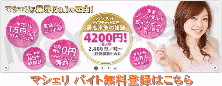 このページで紹介しているライブチャット【マシェリ】、【ライブでGOGO】、【BBチャットTV】のどれかにチャット求人登録された方に元マシェリのTOPチャトレ(チャトレの神様♪)渡辺いづみサンが書かれた初心者向け超濃い〜マニュアルの無料ダウンロードサイトにご案内致します。